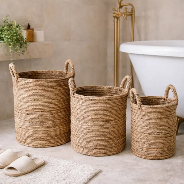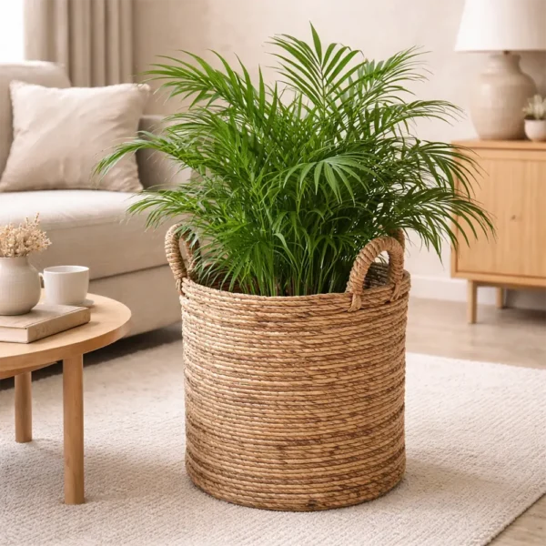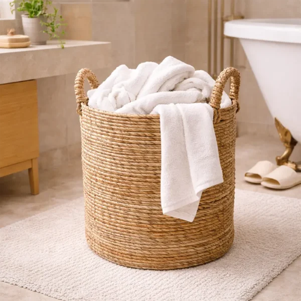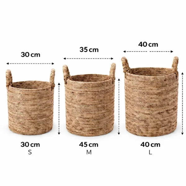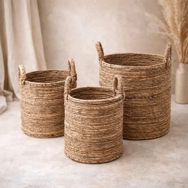 Syailendra ist ein handgeflochtener Aufbewahrungskorb aus robuster Bananenfaser, der Ordnung und Deko elegant verbindet. Du nutzt ihn flexibel als Wäschekorb, Pflanzkorb oder stilvollen Stauraum im Wohnzimmer, Bad oder Schlafzimmer. Dank praktischer Griffe lässt er sich leicht tragen, steht stabil und passt mit seinem minimalistischen Boho Look perfekt zu hellen, natürlichen Wohnstilen. Erhältlich in drei Größen und plastikfrei verpackt.