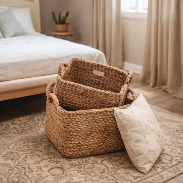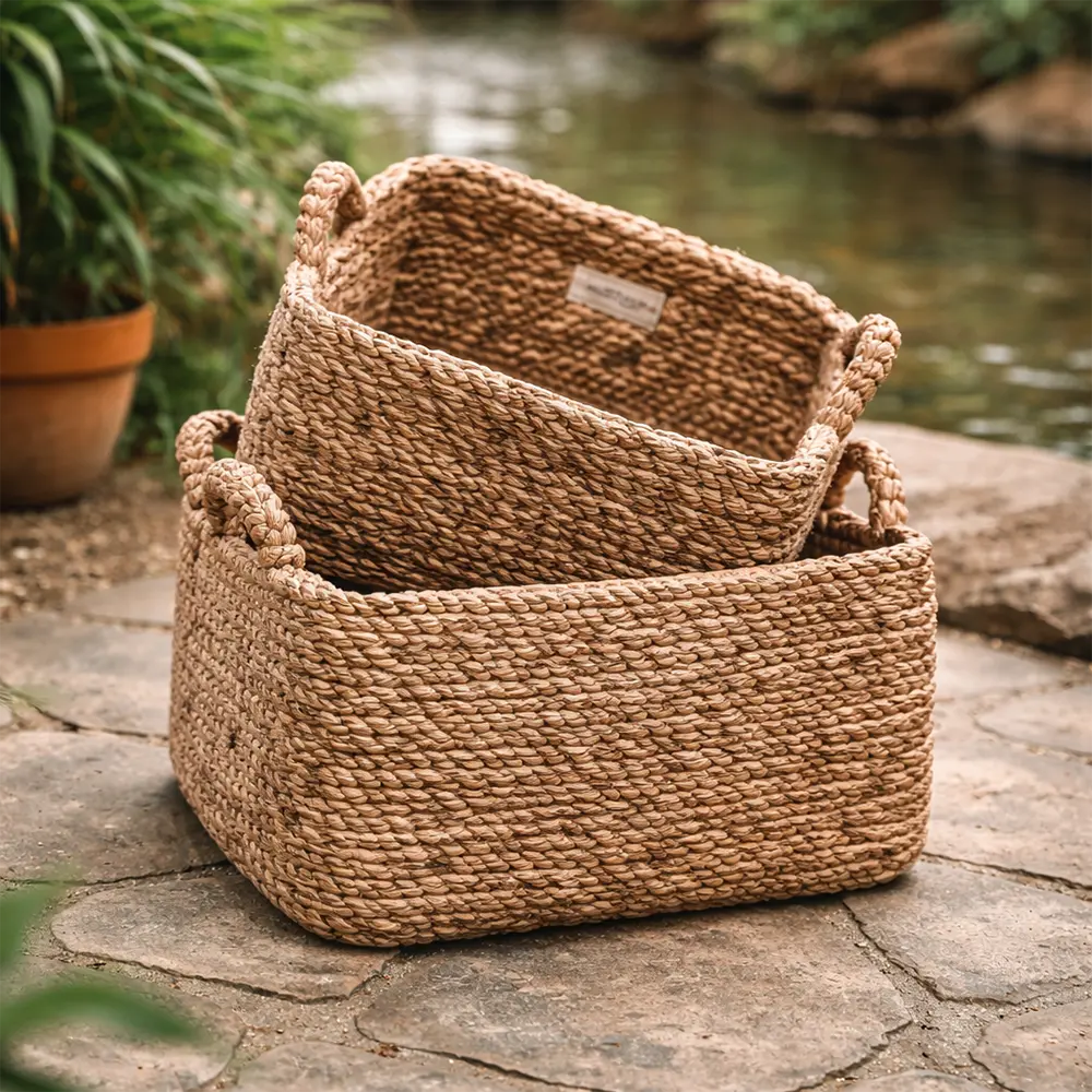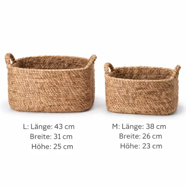 Das Aufbewahrungskorb Tanimbar Set bringt schnell Ordnung in dein Zuhause und sieht dabei richtig hochwertig aus. Die eckige, rechteckige Form passt perfekt ins Regal, in offene Schränke oder auf Sideboards. Ideal als Aufbewahrungskorb groß für Zeitschriften und Decken oder als Aufbewahrungskorb Kinder für Spielzeug im Kinderzimmer. Handgeflochten aus nachhaltiger Wasserhyazinthe, mit Griffen und plastikfreier Verpackung – ein stilvolles Aufbewahrungskorb Set, das du direkt online kaufen kannst.