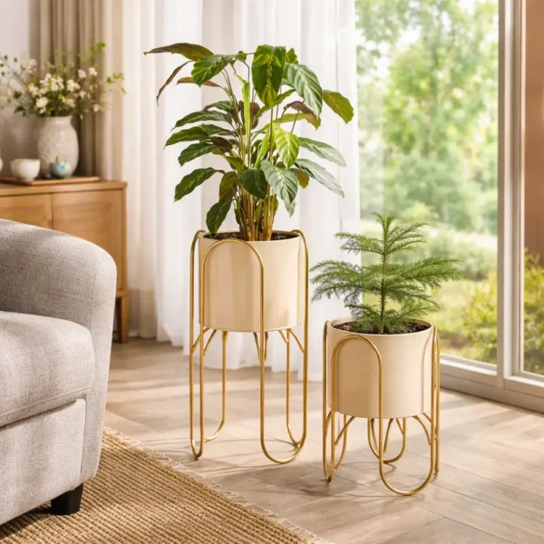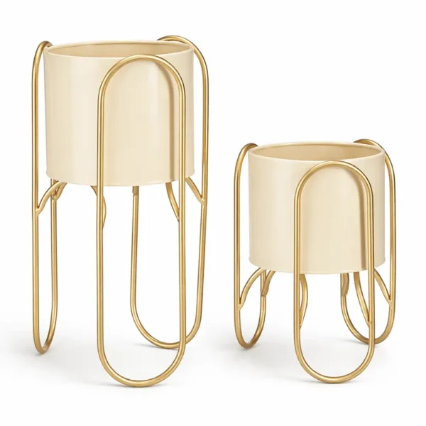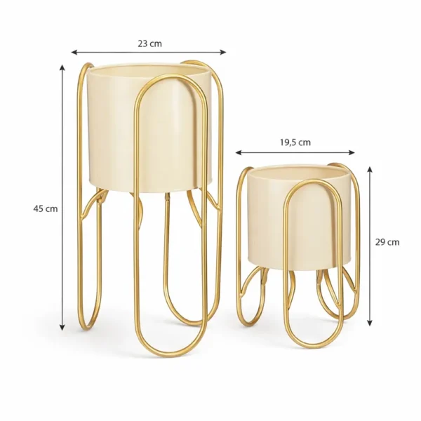 Gerade durch die Kombination aus zwei Größen, hellen Töpfen und goldfarbenen Gestellen entsteht eine elegante Wirkung, die modern und wohnlich zugleich ist.