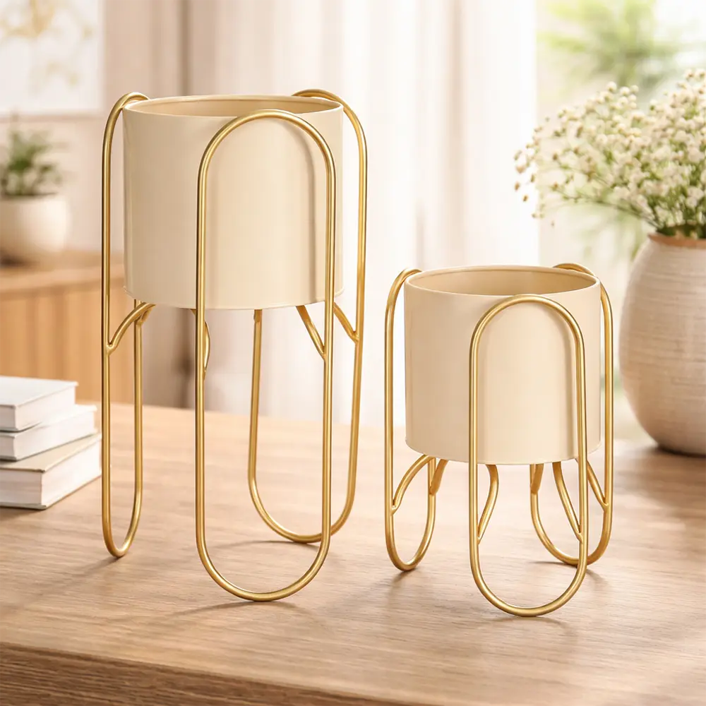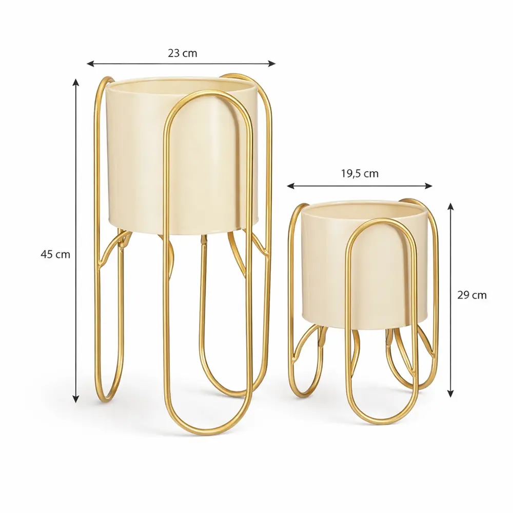 Gerade durch die Kombination aus zwei Größen, hellen Töpfen und goldfarbenen Gestellen entsteht eine elegante Wirkung, die modern und wohnlich zugleich ist.