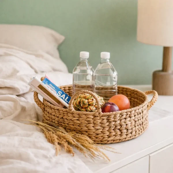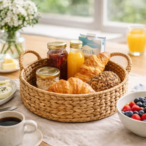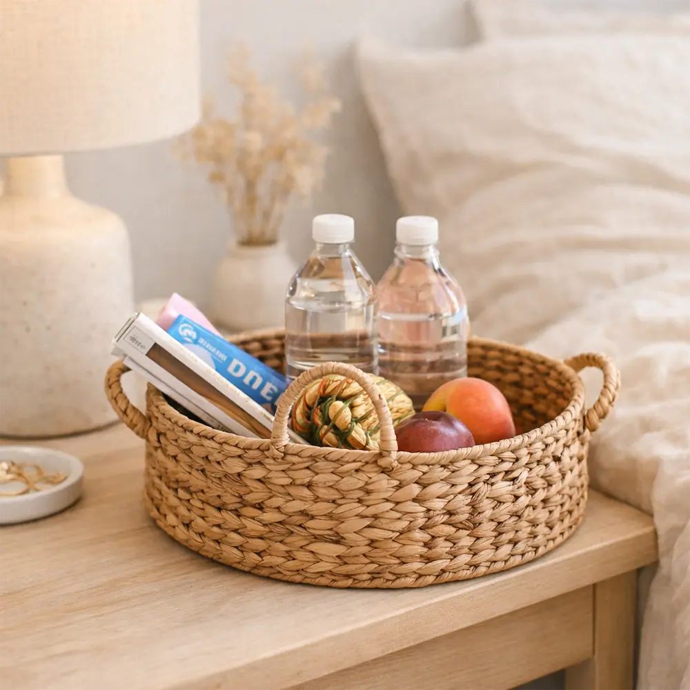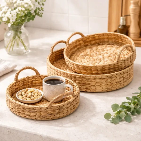 Dieses Deko Tablett rund aus Wasserhyazinthe bringt sofort Ordnung und Stil auf Tisch, Sideboard oder Regal. Als Tablett für Deko wirkt es im Wohnzimmer ruhig und hochwertig, und auf dem Esstisch setzt es deine Kerzen und Lieblingsstücke perfekt in Szene. Dank Metallrahmen bleibt die Form stabil, und die handgemachte Optik passt ideal zu natürlichen, modernen Looks. Ideal, wenn du ein dekoratives Tablett suchst, das praktisch ist und gleichzeitig wie ein echtes Designstück wirkt.