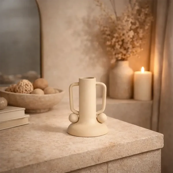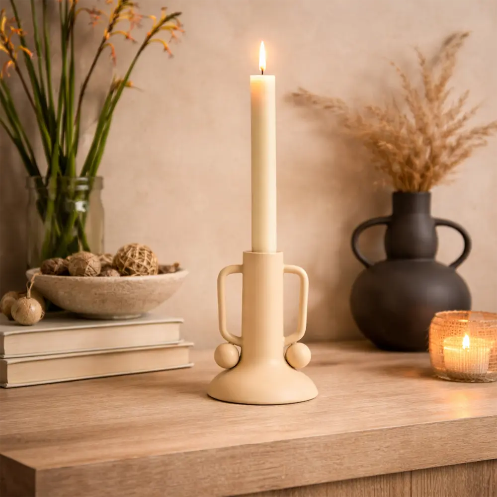 Der Kerzenhalter kommt besonders gut zur Geltung, wenn du ihn mit wenigen ruhigen Elementen kombinierst.