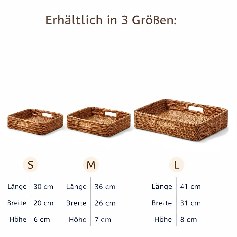 Das Rattan Tablett Amahai ist ein handgefertigtes, rechteckiges Serviertablett in drei Größen. Du nutzt es zum Servieren von Snacks und Getränken oder als stilvolle Ablage auf Esstisch, Küche oder Sideboard. Das natürliche Material wirkt warm und hochwertig, jedes Stück ist ein Unikat und kommt plastikfrei verpackt.