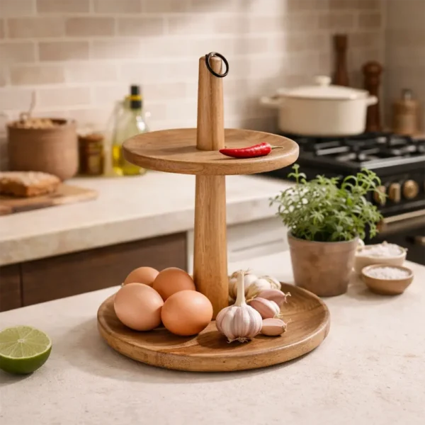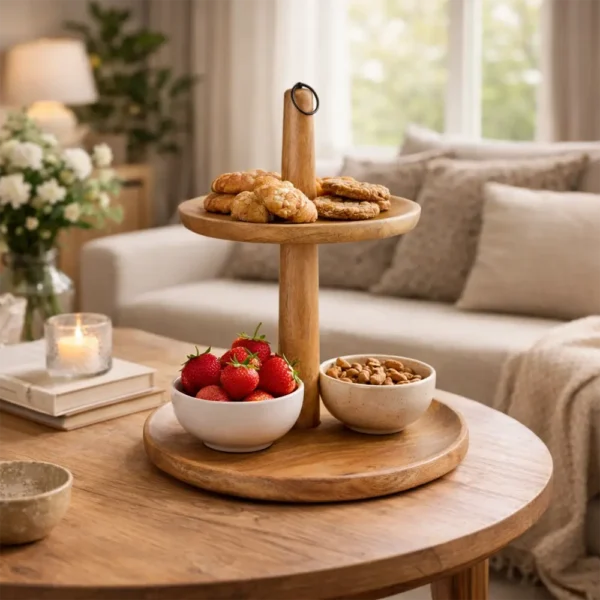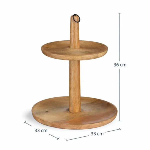 Die Tablett Etagere Caden Holz ist ein stilvolles etagere tablett aus hellbraunem Mangoholz mit zwei Ebenen und praktischer Metallschleife zum Tragen oder Aufhängen. Ideal für Brunch, High Tea, Macarons, Minikuchen und herzhafte Snacks. Als deko tablett etagere bringt sie Wärme auf den Tisch und sorgt für eine ruhige, hochwertige Präsentation.