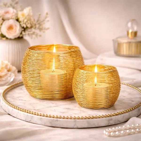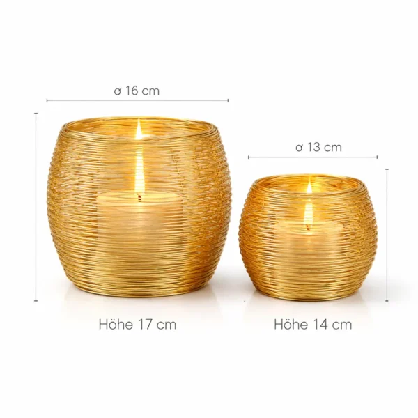 Windlicht Set 2 teilig aus Aluminium in edler Drahtoptik für sofort mehr Gemütlichkeit. Die filigranen Aluminiumfäden lassen das Kerzenlicht weich durchscheinen und erzeugen romantische Lichteffekte im Raum. Du bekommst zwei Größen, groß Ø16 cm Höhe 17 cm und klein Ø13 cm Höhe 14 cm, perfekt für Esstisch, Sideboard oder Fensterbank. Wähle Gold oder Silber, je nachdem ob du es warm festlich oder modern elegant magst. Jedes Windlicht wird von Hand gefertigt, deshalb sind kleine Formunterschiede möglich und genau das macht jedes Stück zum Unikat. Geeignet für LED Kerzen und Echtwachskerzen, ideal auch als moderne Hochzeitsdekoration im Empfangsbereich. Lieferung ohne Deko und ohne Teelichter.