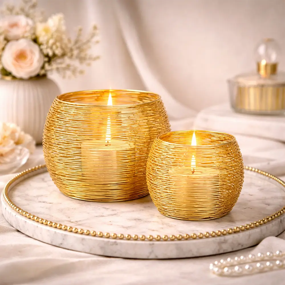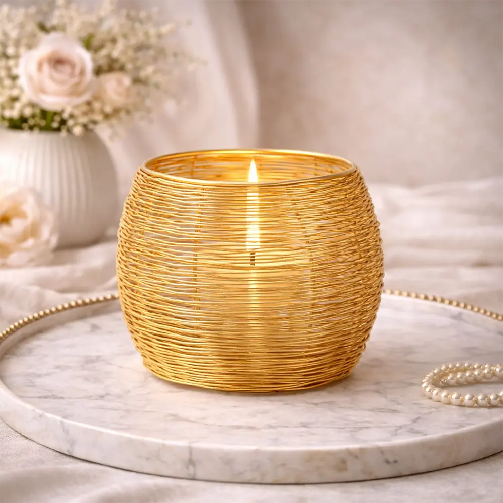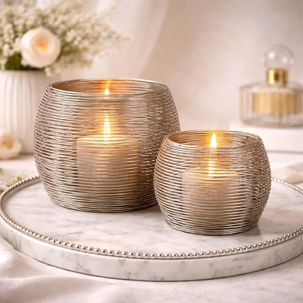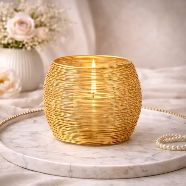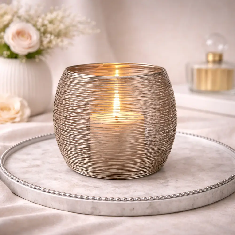 Die filigrane Drahtoptik wirkt leicht und modern, während das Kerzenlicht durch die Aluminiumfäden weich gebrochen wird.