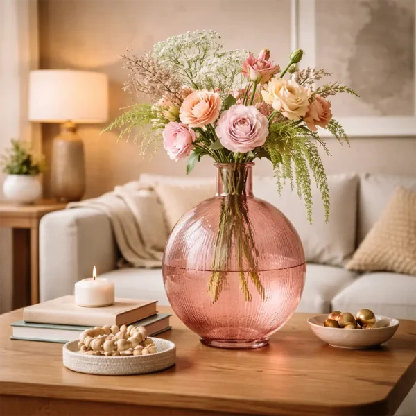 Auf dem Esstisch ist sie eine Vase Deko Glas mit sanftem Farbton, die den Tisch nicht überlädt. Auf einer Fensterbank oder einem Wandtisch